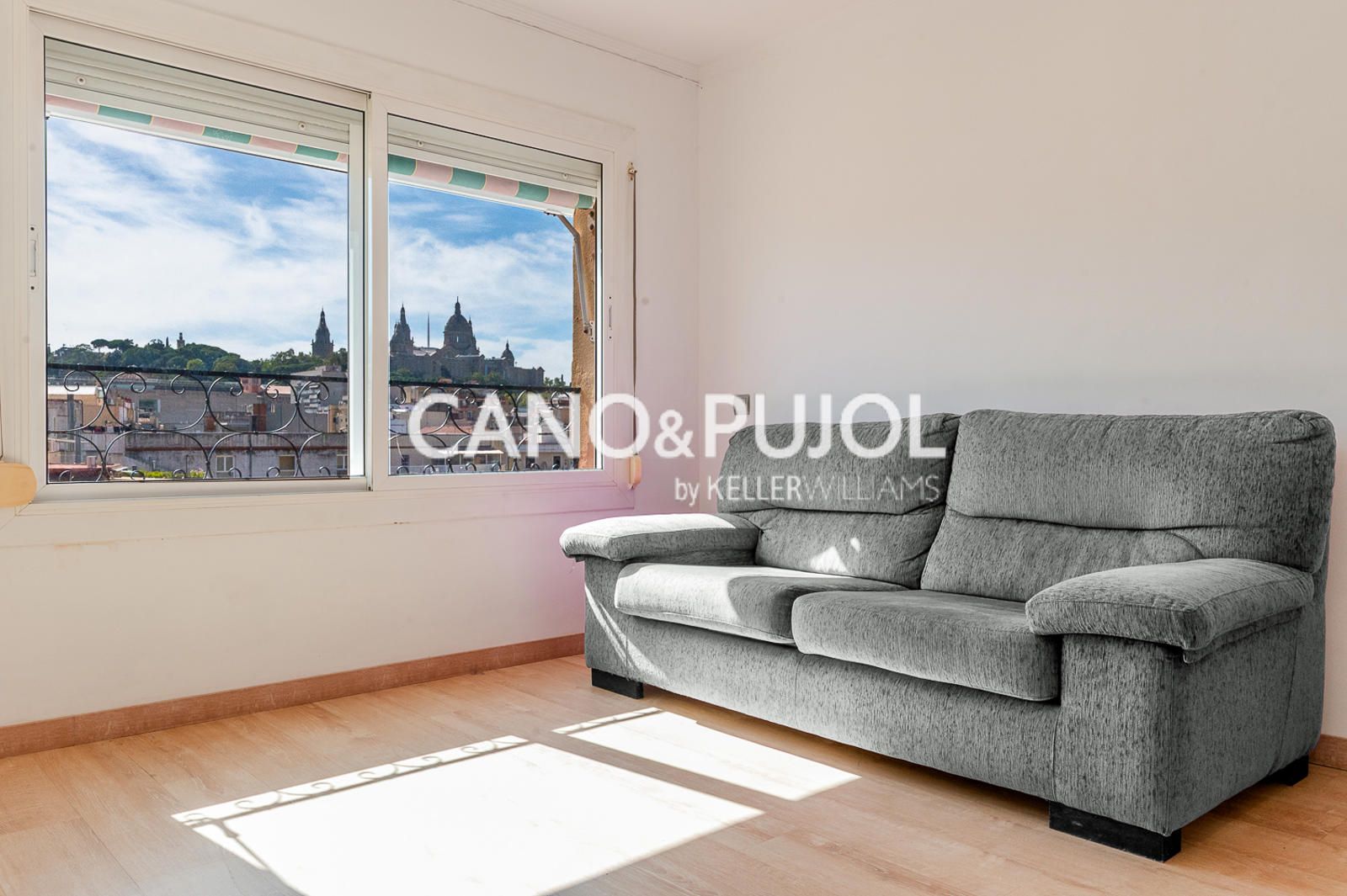 El salón-comedor se abre a una terraza privada de 10 m² con vistas despejadas a Montjuïc y al MNAC, un espacio perfecto para relajarse, trabajar desde casa o disfrutar de la luz natural durante todo el día.