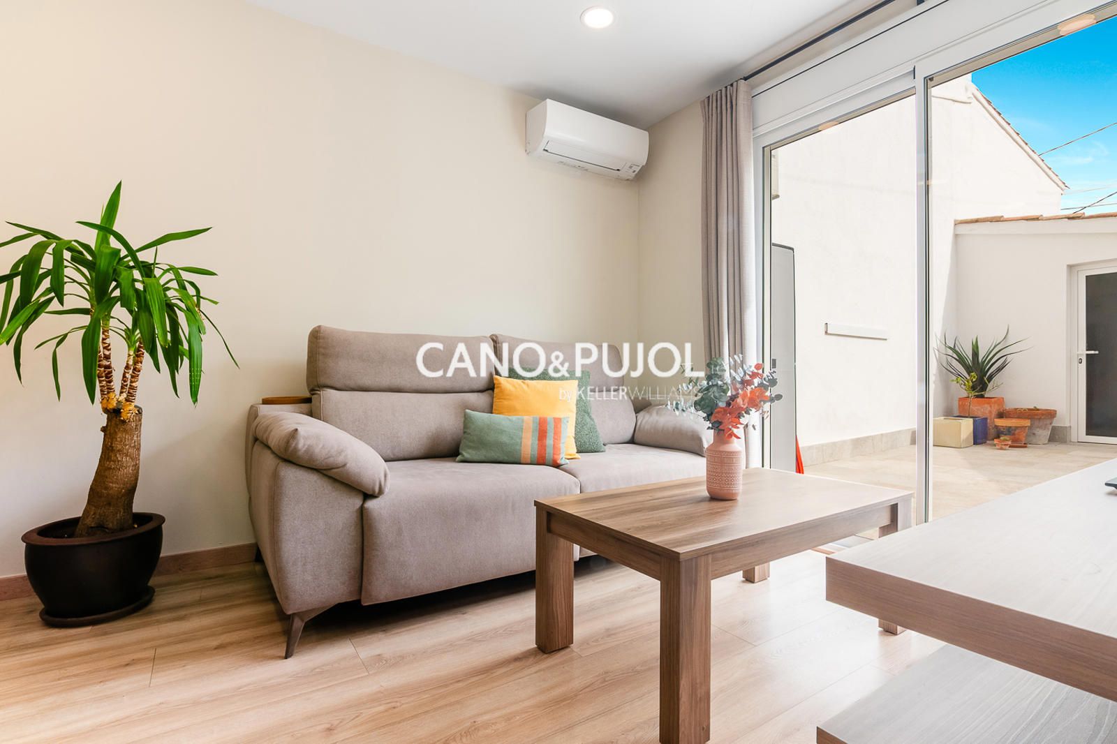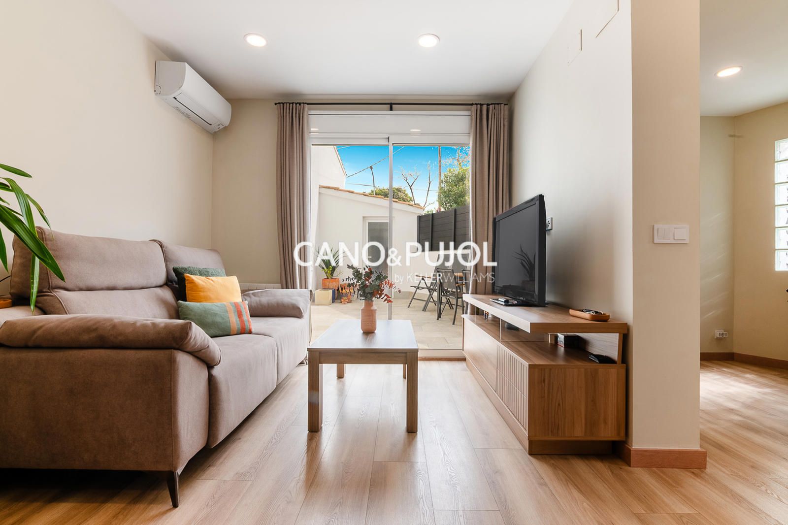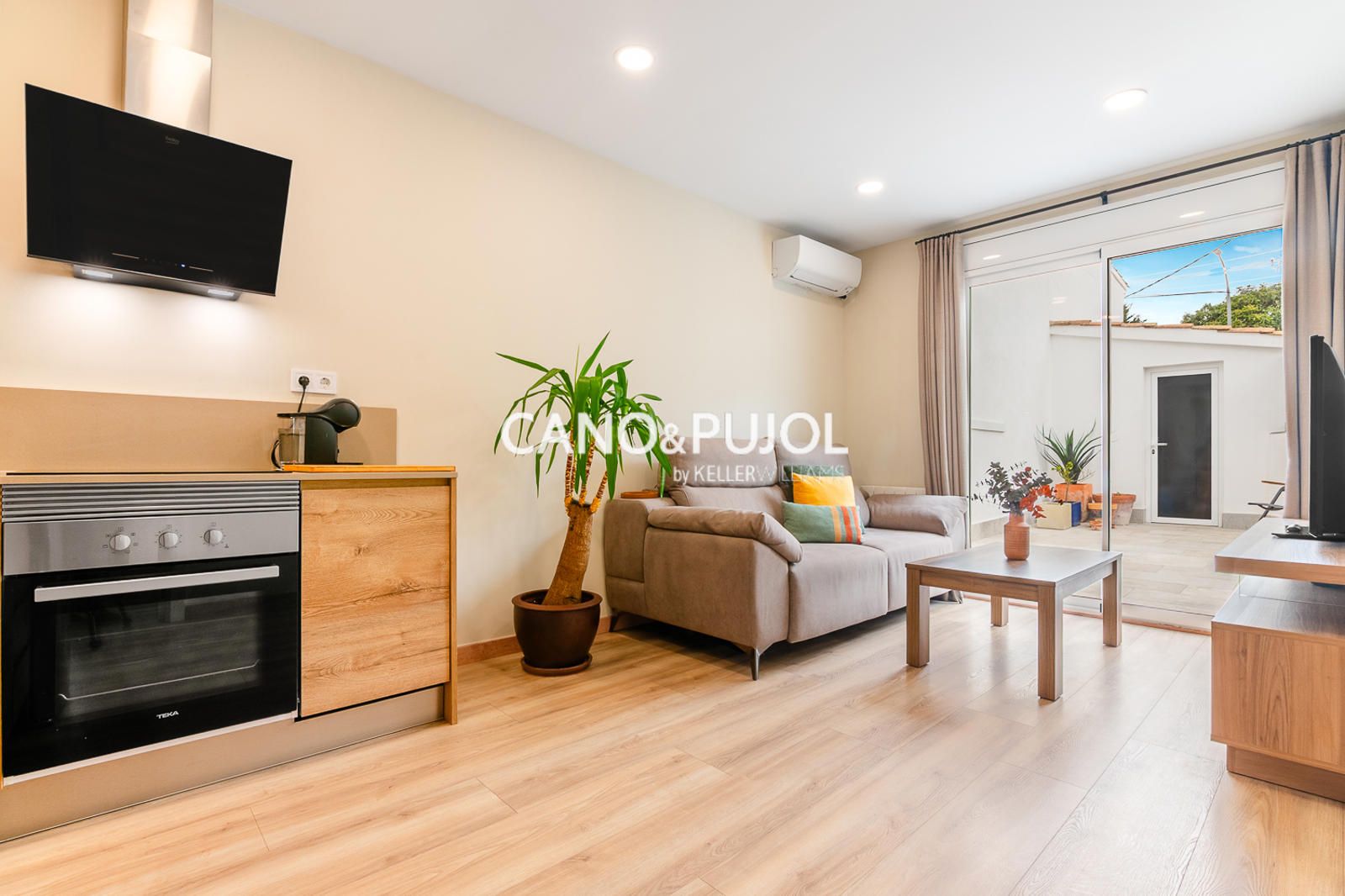 Al acceder a la casa encontramos un agradable recibidor que da paso a un luminoso salón comedor con cocina abierta, equipada con vitrocerámica y perfectamente integrada en el espacio. Desde el salón se accede directamente a una amplia terraza privada, un espacio muy agradable para disfrutar del exterior, crear una zona chill-out o un pequeño rincón verde, con gran privacidad ya que no tiene vistas directas de vecinos.